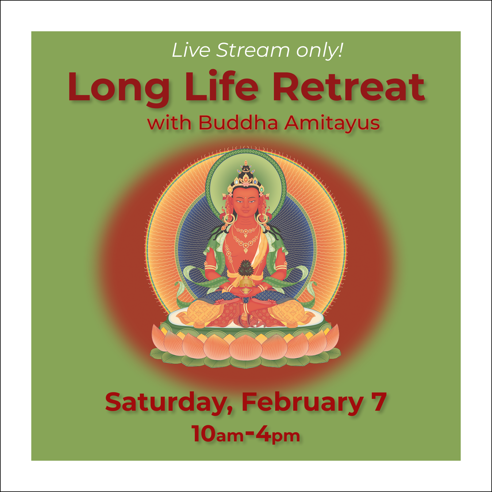 Buddha Amitayus is the Buddha of long life, merit and wisdom. This annual retreat is our prayer to Amitayus to help us remove obstacles to spiritual development, prevent untimely death, and attain the deathless state of enlightenment.